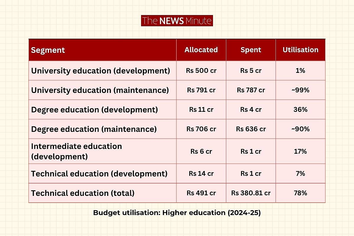 In the 2024-25 budget, Rs 2,850.9 crore was allocated for higher education. Only Rs 2,258 crore was spent, marking a shortfall of nearly Rs 600 crore. This underspending is sharpest in development funds, which are meant for infrastructure, equipment, and institutional capacity. The following figures are drawn from the state's own budget documents: